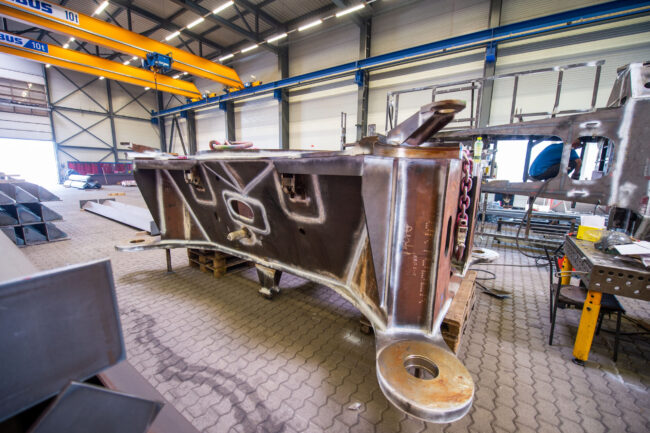 Dieses Bauteil ist die Unterkonstruktion für den Mobilkran AC 500 der Firma Tadano. Der Unterwagen hat eine Länge von 18 Metern und wiegt 20 Tonnen.