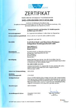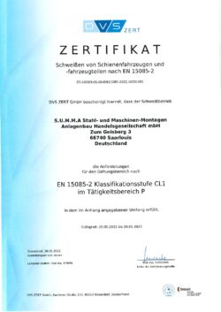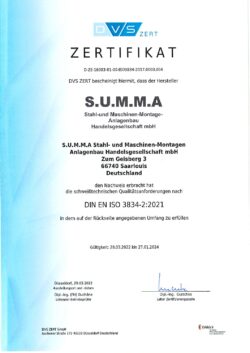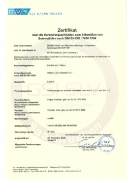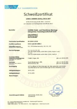 Wir sind zertifiziert nach DIN 1090-2 EX-Class 4 und Feinkornbaustähle bis S 960, sowie Bewehrungsstahlschweißen bis 40mm. Weiterhin verfügen wir über die DIN EN 9001 und ISO 45001 : 2018.